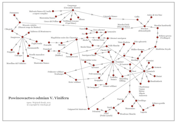 Känns det invecklat? Du är inte ensam om att tycka det! Kartläggningen av våra druvsorters släktskap är rörigt och härligt i stil med ett invecklat familjedrama som inte ens Bergman kunnat skriva ihop bättre. Vill du veta mer vill vi slå ett slag för det fascinerande uppslagsverket Wine Grapes!